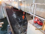 Au moment de descendre la plateforme vers le fleuve, la chaîne d’un des quatre palans qui tiennent la plateforme se coince. Un des travailleurs tente de la débloquer en tirant dessus depuis la barge.