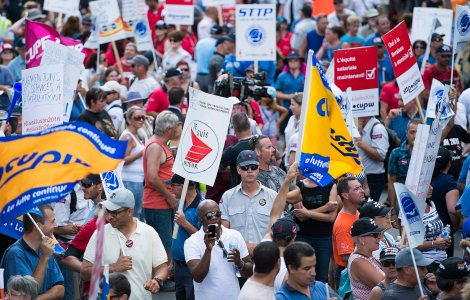 Plusieurs centaines de travailleurs ont manifesté bruyamment devant le bureau de comté du premier ministre, à l’intersection des rues Jarry et Lajeunesse, dans l’arrondissement Villeray-Saint-Michel-Parc Extension.