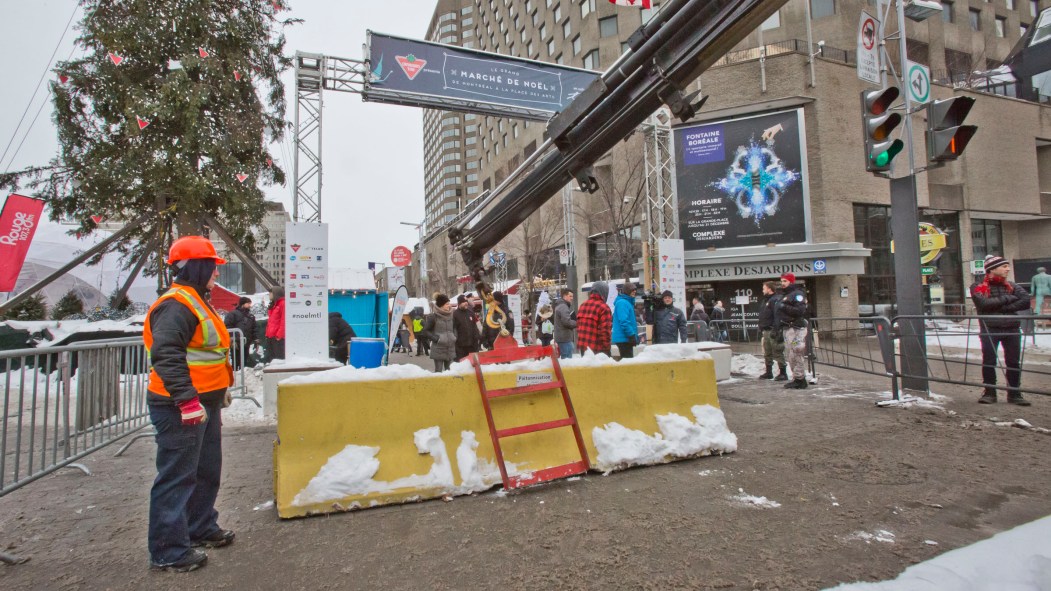 «Dès qu’on a pris connaissance des événements de Berlin, les partenaires du Quartier des spectacles, la police, les pompiers, le promoteur de l’événement, l’arrondissement de Ville-Marie et la Ville de Montréal se sont rencontrés pour établir un processus préventif», a expliqué Marie Lamoureux, conseillère aux relations publiques du Quartier des spectacles. La décision a donc été prise de poser des blocs de béton. (…) Pour le moment, c’est tout.»
