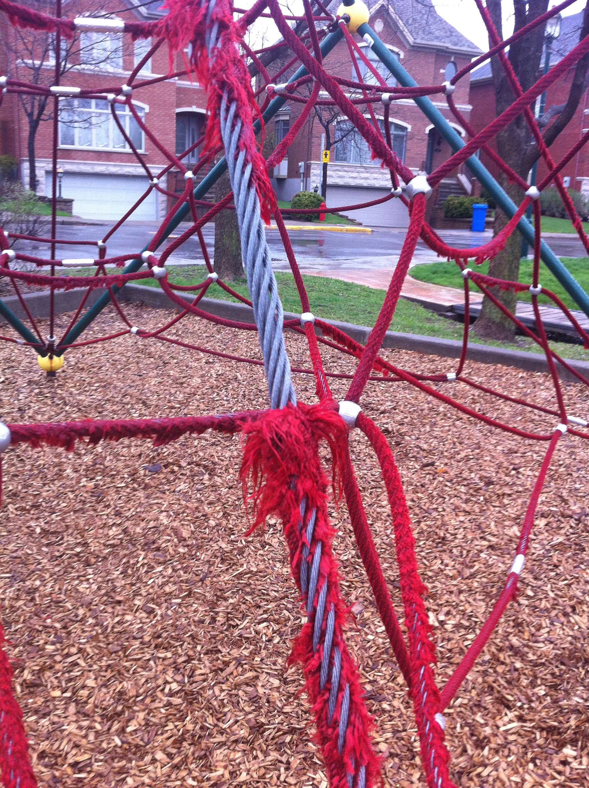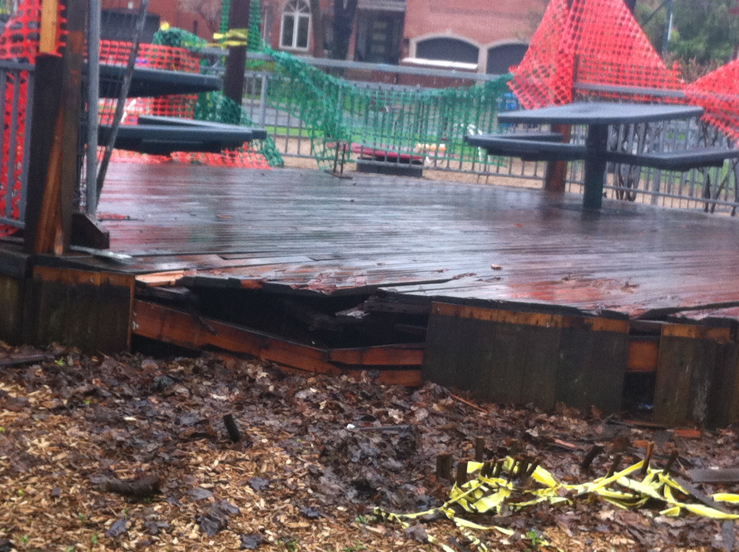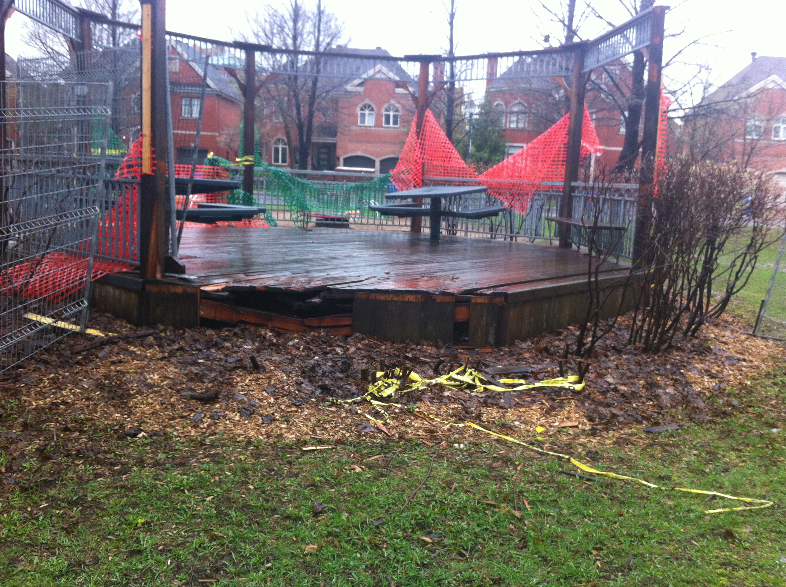 Le toit du gazebo s’est effondré l’hiver dernier sous le poids de la neige et a endommagé la structure en bois, dont une partie de son socle. Des filets de sécurité ont été installés, mais nombre d’entre eux ont déjà commencé à se détacher. Les jeunes aventuriers sont susceptibles de se blesser avec l’une des échardes apparentes.