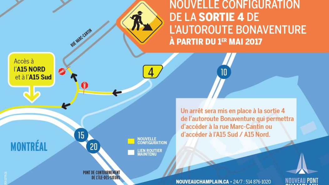 Une nouvelle configuration a également été mise en place au début du mois dans le secteur Gaétan Laberge. Au niveau de la sortie 4 de l’autoroute Bonaventure, un arrêt a été installé et permet présentement d’accéder à la rue Marc-Cantin ou à l’A15 Sud/A15 Nord.