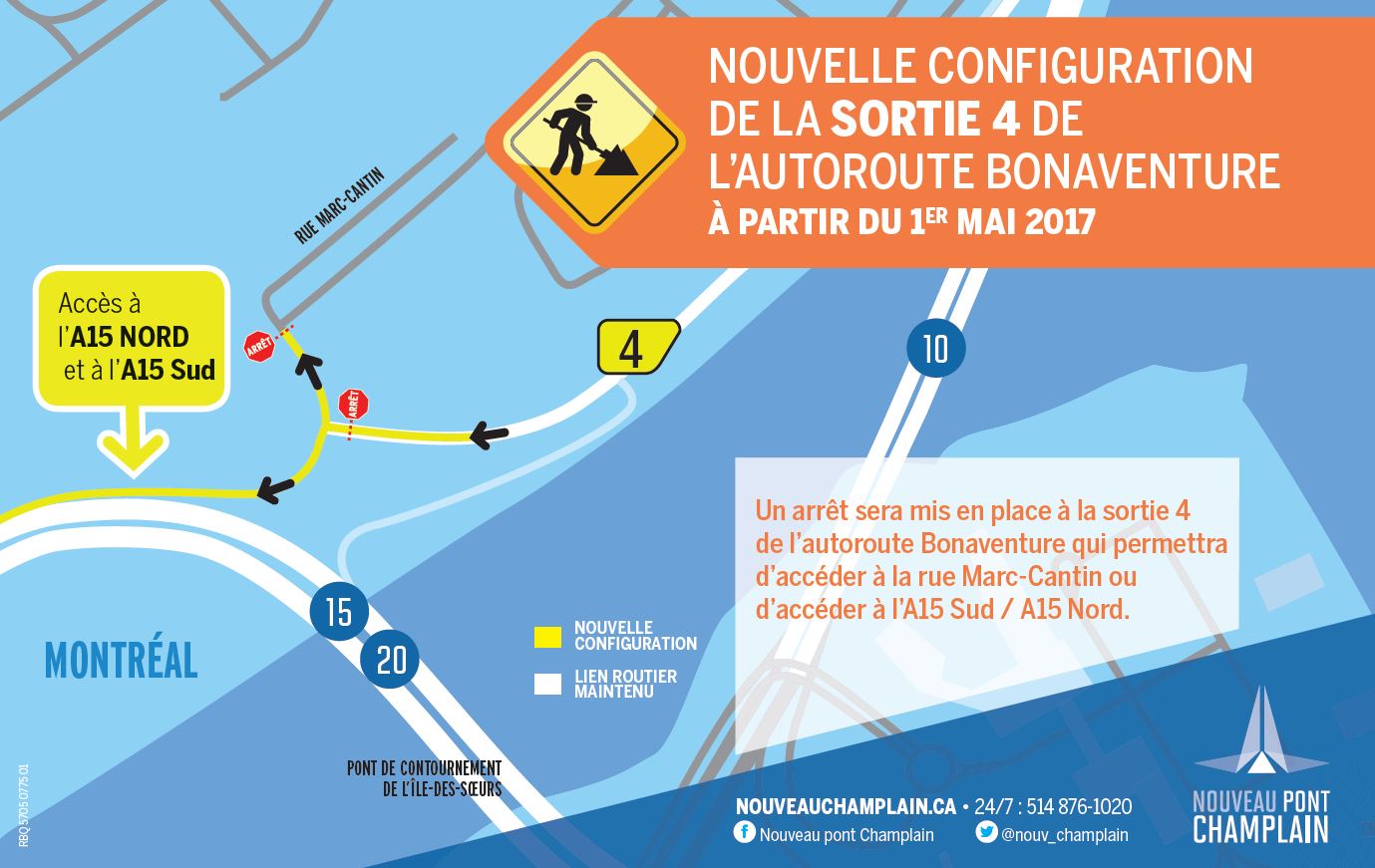 Une nouvelle configuration a également été mise en place au début du mois dans le secteur Gaétan Laberge. Au niveau de la sortie 4 de l’autoroute Bonaventure, un arrêt a été installé et permet présentement d’accéder à la rue Marc-Cantin ou à l’A15 Sud/A15 Nord.