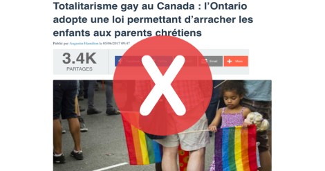De nombreux sites internet chrétiens et conservateurs ont rapporté qu’une loi ontarienne – la loi 89 – permettrait au gouvernement «d’arracher» des enfants de la garde de leurs parents, si ceux-ni n’acceptent pas leur identité sexuelle. D’autres médias en ligne ont par la suite repris le sujet.