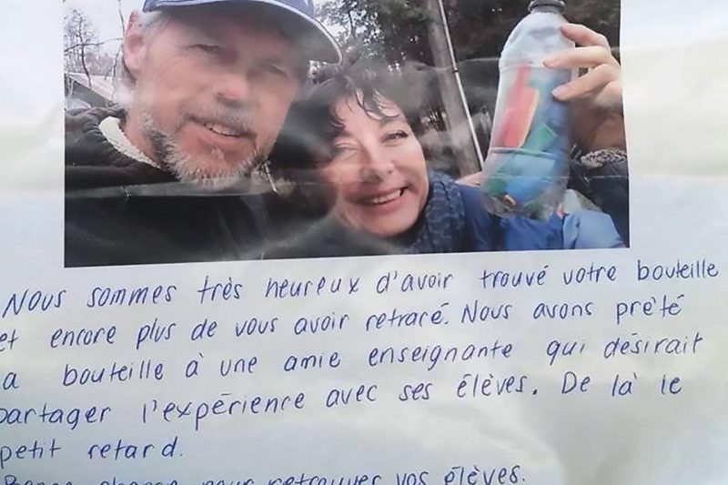 Le couple a posté un mémo à l’enseignante: «Nous sommes très heureux d’avoir trouvé votre bouteille et encore plus de vous avoir retracés. Nous avons prêté la bouteille à une amie enseignante qui désirait partager l’expérience avec ses élèves. De là le petit retard. Bonne chance pour retrouver vos élèves. Luc et Yolande». Sur ce mémo, une photo du couple avec la bouteille et la berge où elle gisait.