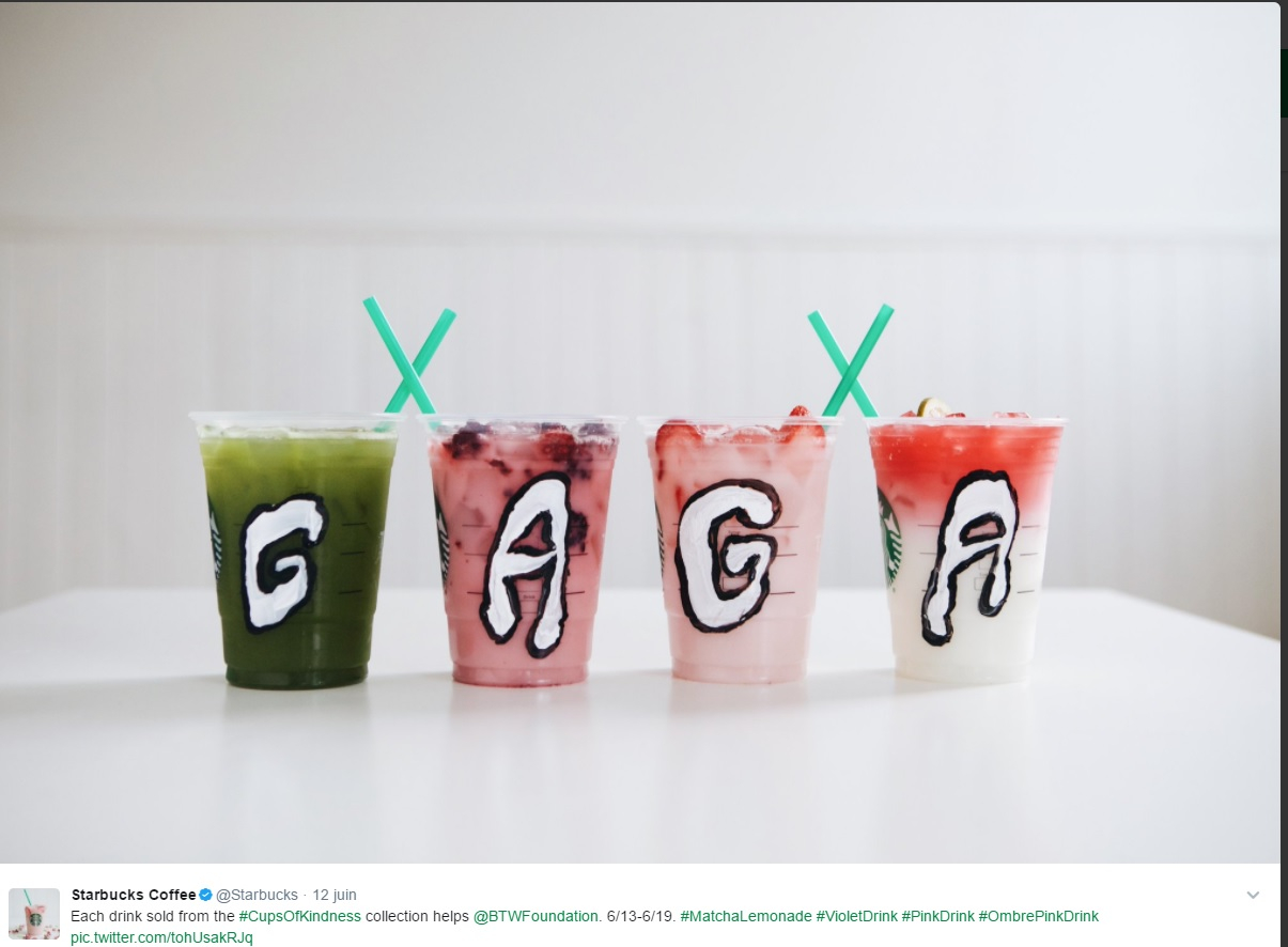 Jusqu’au 19 juin, les salons américains de Starbucks concoctent les quatre breuvages signées Lady Gaga, tous aux couleurs de l’été. L’interprète de Paparazzi s’est associé à l’entreprise pour une collection intitulée «Cups of kindness». Comprendre : les tasses de la gentillesse. Pour chaque boisson vendue, Starbucks s’est engagé à reverser 0,25 $US (0,33 $) à l’association de la star «Born This Way Foundation».