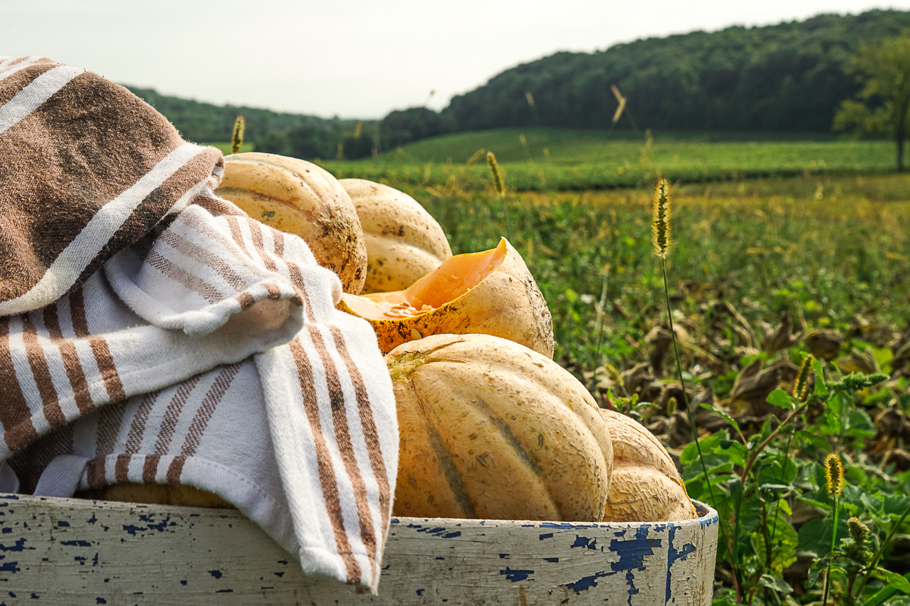 Manon Dolbec, agricultrice et propriétaire du champ, accueille un petit groupe de personnes venues cueillir le fruit d’un travail collectif de plus de trois ans. Dans le groupe, il y a celui qui a redécouvert la semence, celle qui a participé à sa renaissance et ceux qui partageront ce melon avec le public.