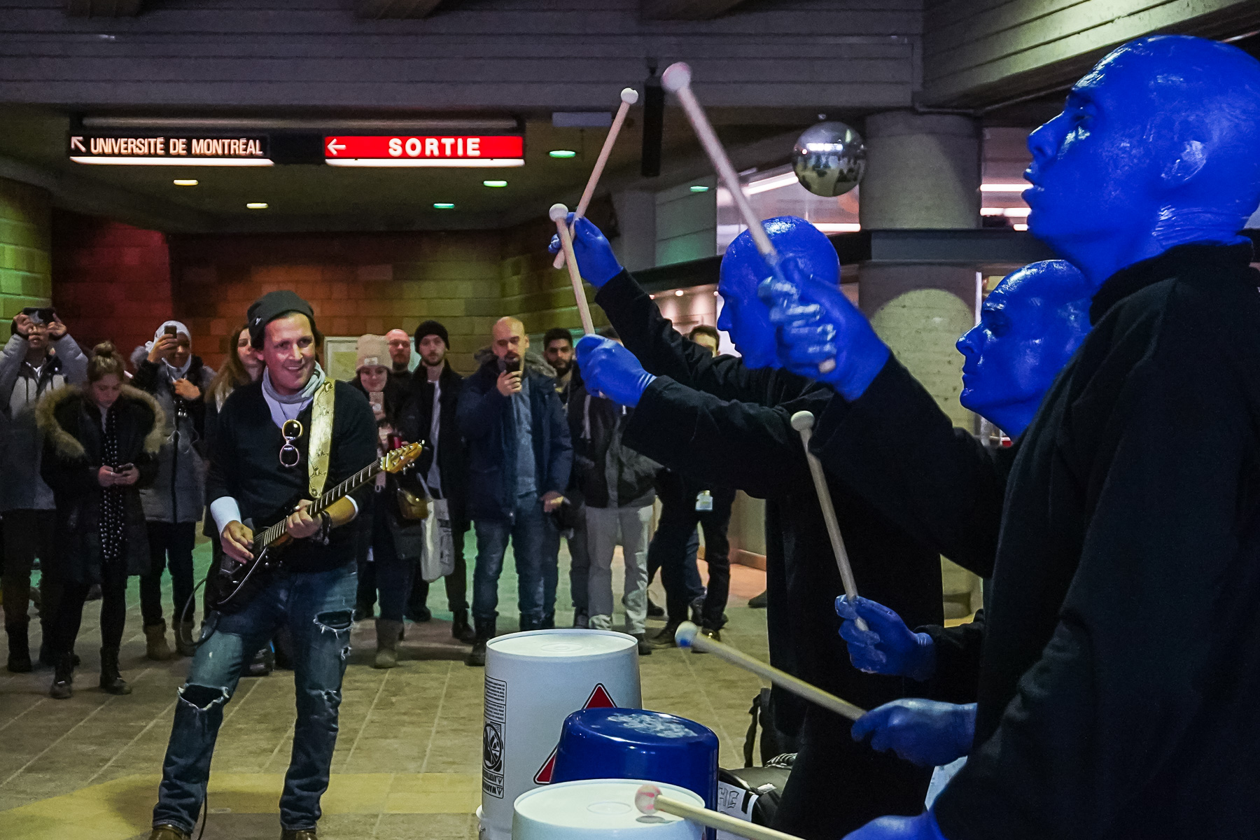 Peints entièrement en bleu, les trois hommes du groupe ont emprunté la ligne bleue en fin d’avant-midi, depuis la station Saint-Michel. Peu avant le terminus, ils se sont arrêtés à la station de l’Université de Montréal (UdeM) pour s’offrir en performance. Quelques dizaines d’usagers du métro étaient présents au moment des faits, pour photographier et filmer le mini-concert. Des musiciens du groupe ont aussi participé à l’événement.