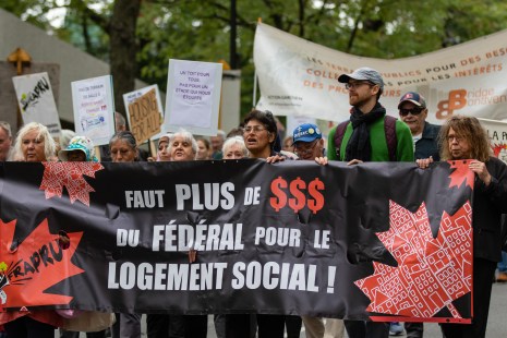 «On veut des engagements clairs, il faut arrêter de mettre en dessous de la liste les gens qui crèvent de faim, ou qui vivent dans des taudis parce qu’ils n’ont pas d’autres endroits où aller, parce qu’ils n’ont pas les moyens de se payer mieux», a déclaré la porte-parole du FRAPRU, Véronique Laflamme devant une centaine de manifestants au square Dorchester dimanche.