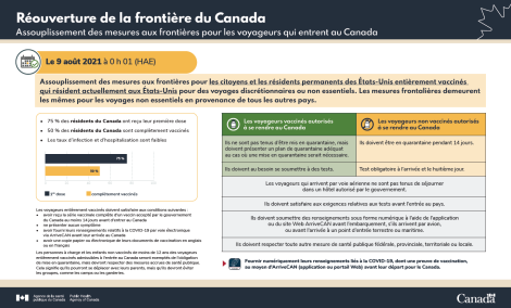 Ottawa autorise les déplacements discrétionnaires pour les citoyens et les résidents permanents des États-Unis, dès le 9 août, à la condition que ceux-ci soient entièrement vaccinés et que la situation épidémiologique de la COVID-19 au Canada le permette. Les autres voyageurs de la planète seront autorisés à rentrer sur le territoire le 7 septembre prochain aux mêmes conditions.