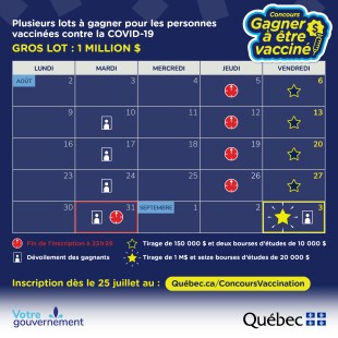 Respectivement 600 000$ en argent et 80 000 $ en bourses d’études seront distribués pendant les quatre tirages hebdomadaires de ce «loto-vaccin».