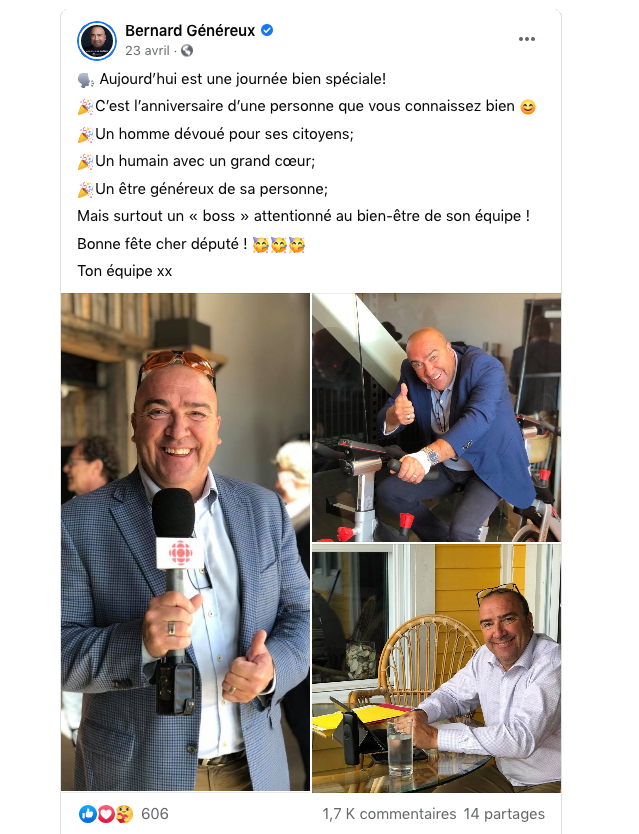 Le politicien qui a provoqué le plus de commentaires dans une publication Facebook (si on fait abstraction de Justin et de Maxime, ici), est l’inénarrable député conservateur Bernard Généreux. Le 23 avril, son équipe lui souhaitait bon anniversaire, ce qui a déclenché un déluge de «Bonne fête» et de GIF de gâteaux ou de feux d’artifice dans les commentaires sous la publication. M. Généreux, en bon politicien 2.0, a répondu à chacun de ces quelque 1000 souhaits!
