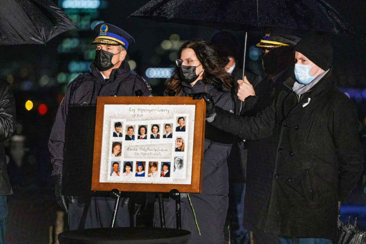 Chaque fois que le nom d’une victime a été prononcé, un faisceau lumineux s’allumait en direction du ciel. On a entendu les noms de Geneviève Bergeron, Hélène Colgan, Nathalie Croteau, Barbara Daigneault, Anne-Marie Edward, Maud Haviernick, Barbara Klucznik-Widajewicz, Maryse Laganière, Maryse Leclair, Anne-Marie Lemay, Sonia Pelletier, Michèle Richard, Annie St-Arneault et Annie Turcotte