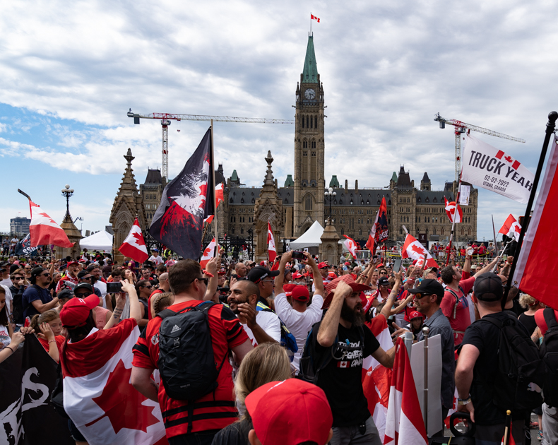De nombreux manifestants ont défilé dans les rues du centre-ville d’Ottawa à l’occasion de la fête du Canada ce vendredi. Contrairement à celle qui a eu lieu au printemps dernier dans la capitale, la manifestation s’est déroulée dans une ambiance plus détendue et plus festive.