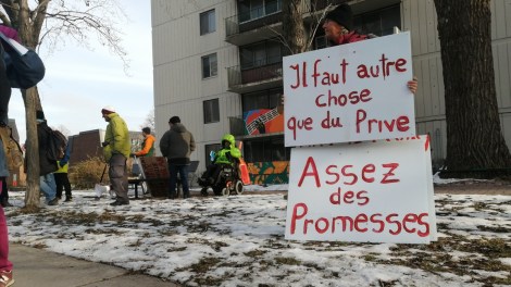Plusieurs manifestants étaient présents face aux Habitations Coursol pour réclamer plus d’actions et moins de promesses. Caption: David Beauchamp