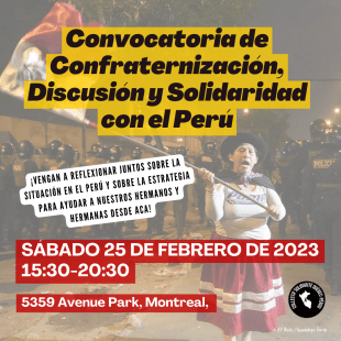 Le Collectif organise une rencontre de discussion et de solidarité avec le peuple péruvien ce samedi, 25 février, dès 15h30, aux locaux de l’Association des travailleurs grecs du Québec, situés au 5359, avenue du Parc.