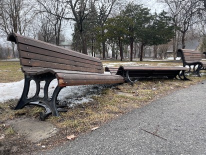 Dès les premiers mètres à l’entrée du parc La Fontaine, il devient impossible de compter le nombre de branchages au sol. Le mobilier urbain est aussi abîmé. Un abribus sur la rue Rachel est passé à un cheveu de la catastrophe. Plusieurs bancs se sont enfoncés dans le sol sous le poids du gel. La glace a même brisé certains pieds du mobilier.