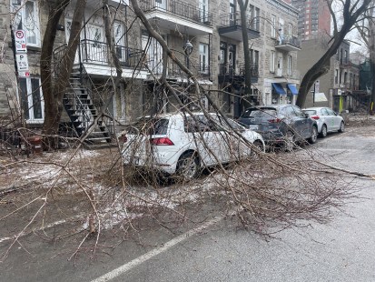 Les voitures, comme les arbres, ont presque toutes dégelé, mais certaines croulent sous les branchages. En levant la tête, les passants s’aperçoivent que les habitations sont aussi concernées. Un balcon est saturé de branches. Son propriétaire est monté sur le toit avec une tronçonneuse pour tenter de couper une énorme branche qui menace de s’écrouler sur sa fenêtre.