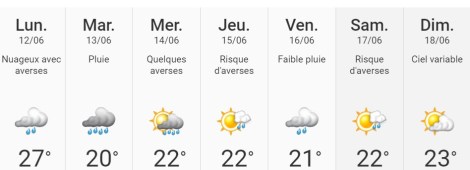 Les températures baisseront dès mardi où 20 degrés et de la pluie sont attendus dans la plus grande ville du Québec. Pour le reste de la semaine, il fera entre 20 et 24 degrés, et le ciel demeura couvert, à l’exception des journées de jeudi, samedi et dimanche. Le risque d’averses sera tout de même présent.