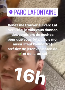 «Venez me retrouver au Parc Laf vers 16h, je vais vous donner des cendriers de poche pour que vous (et parfois moi aussi, il faut l’admettre) arrêtiez de jeter vos [mégots] au sol», a-t-il écrit dans une story Instagram.