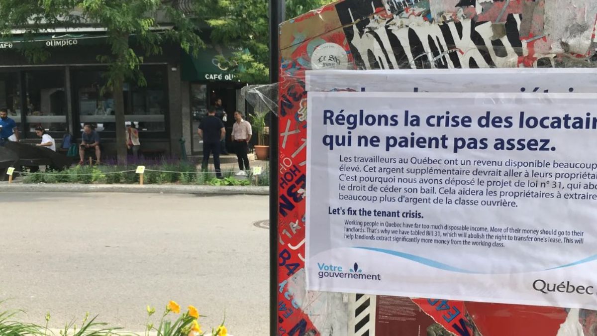 «Les travailleurs au Québec ont un revenu disponible beaucoup trop élevé. Cet argent supplémentaire devrait aller à leurs propriétaires. C’est pourquoi nous avons déposé le projet de loi nᵒ31, qui abolira le droit de céder son bail. Cela aidera les propriétaires à extraire beaucoup plus d’argent de la classe ouvrière», est-il écrit sur l’affiche où est apposée la signature officielle du Gouvernement du Québec.