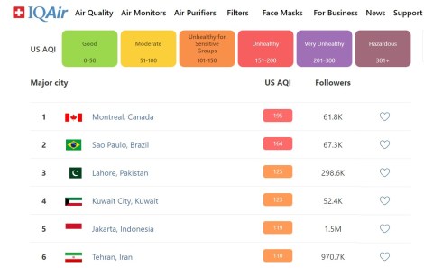 «La concentration de PM2,5 ( les principaux polluants) à Montréal est actuellement 37.5 fois supérieure à la valeur guide annuelle de l’OMS pour la qualité de l’air», détaille IQAir.