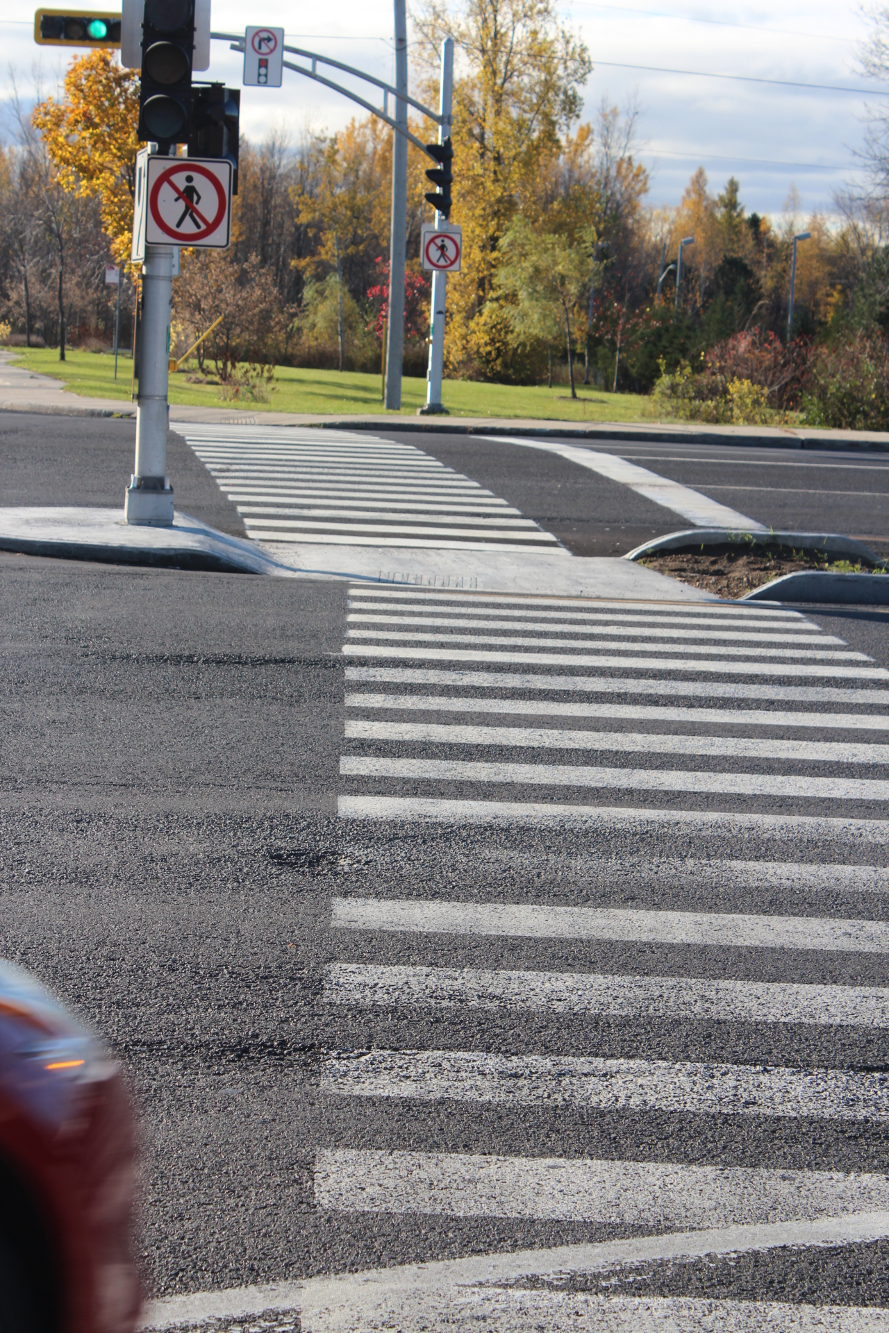Un nouveau passage piétonnier permettant de traverser la route 116 à Saint-Bruno interdit aux marcheurs de l’utiliser dans une des deux directions. D’un côté, une signalisation pour les piétons a été mise en place, de l’autre, des panneaux d’interdiction de traverser.