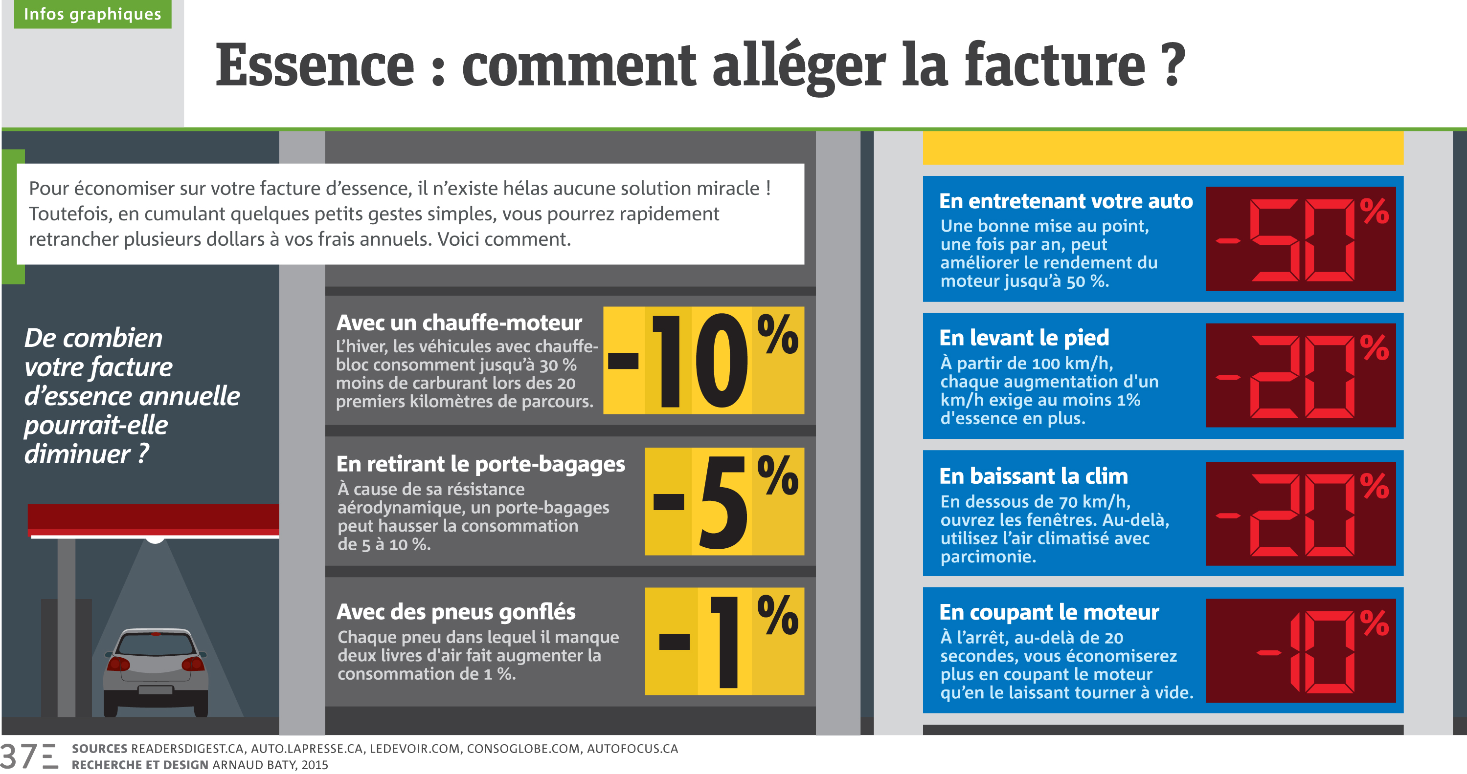 Pour économiser sur votre facture d’essence, il n’existe hélas aucune solution miracle. Toutefois, en cumulant quelques petits gestes simples, vous pourrez rapidement retrancher plusieurs dollars à vos frais annuels. Voici comment.