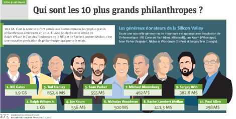 10,2G$. C’est la somme qu’ont versée aux bonnes œuvres les 50 plus grands philanthropes américains en 2014. Et avec les décès cette année de Ralph Wilson Jr (l’un des fondateurs de la NFL) et de Rachel Lambert Mellon, c’est une nouvelle génération de philanthropes qui prend le relais.
