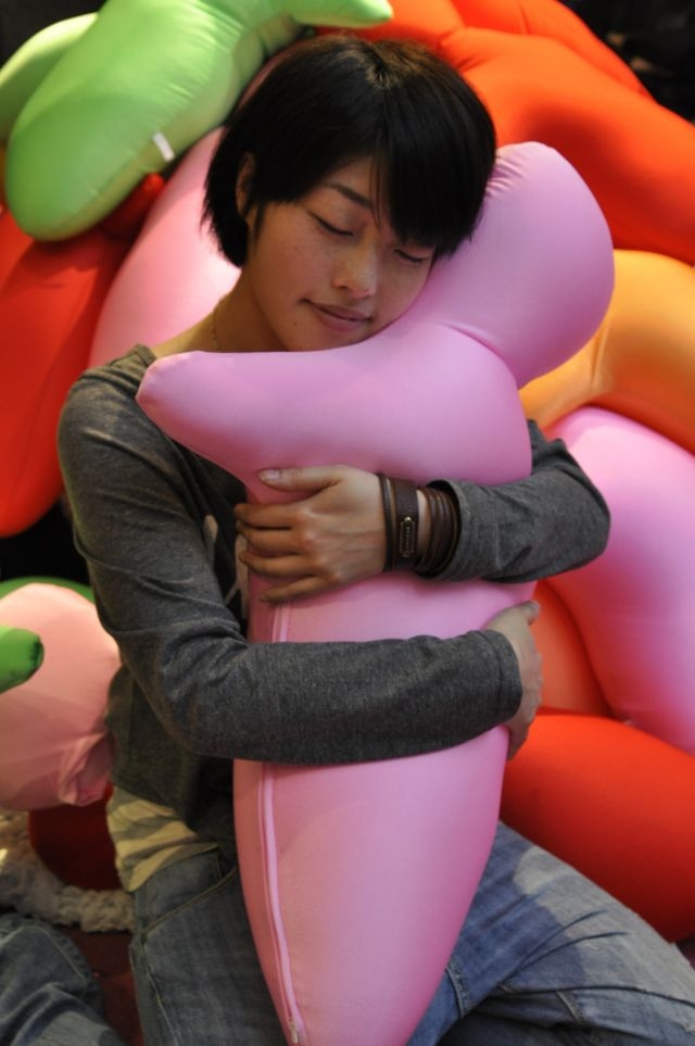 Hugvie, dans lequel il faut glisser son téléphone avant de le prendre dans ses bras, est censé rendre la communication interpersonnelle distante plus tangible et relaxante.