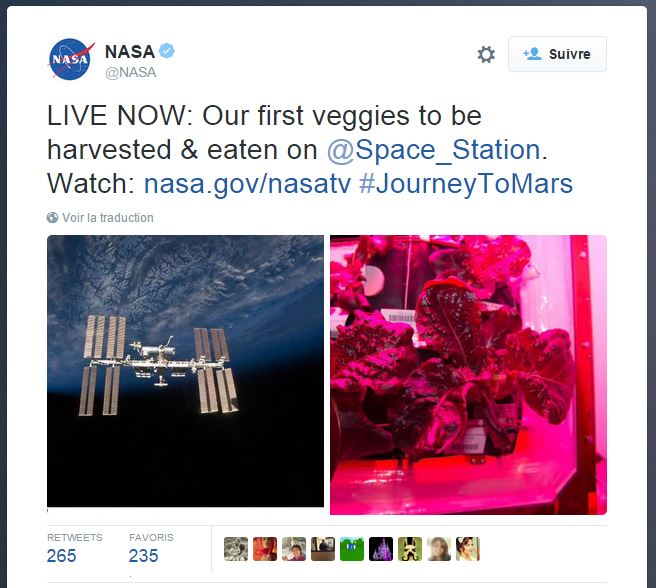« Il y a des indications que des fruits et légumes frais comme les tomates, les myrtilles et des laitues romaines sont de bonnes sources d’antioxydants », a souligné dans un communiqué Ray Wheeler, le responsable du programme de la NASA pour le développement de techniques permettant d’assurer le maintien des conditions de la vie dans l’espace.