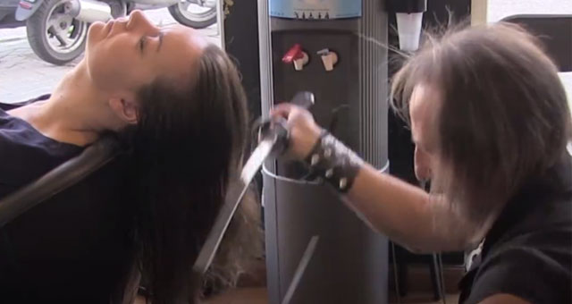 C’est avec calme qu’Alberto Olmedo explique ses drôles de méthodes pour couper les cheveux de ses clientes. Avec un chalumeau à 1300 degrés, il brûle les pointes des cheveux pour en faire une coupe. Avec ses épées, il utilise des mouvements d’art martiaux et écourte ainsi une longue chevelure tout doucement.