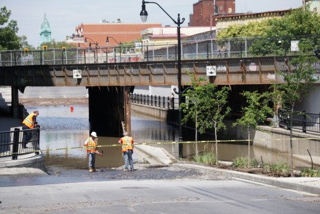 La conduite en cause daterait de 1907 et se serait déversée vers le boulevard Saint-Laurent, sous le viaduc. Le Plateau-Mont-Royal procédait à l’excavation et oeuvrait à réparer la conduite au courant de la soirée de lundi.