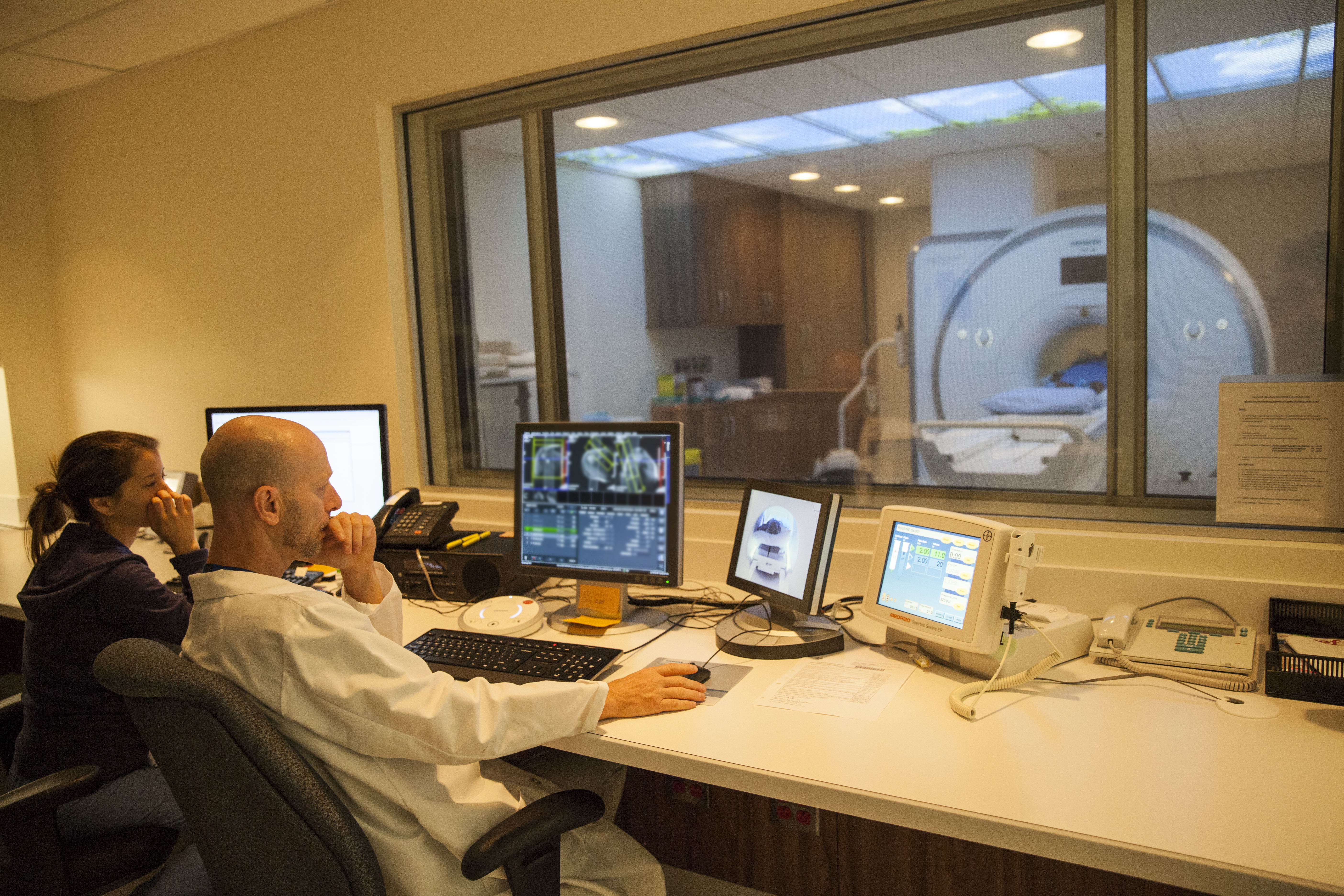 « J’ai travaillé dans plusieurs endroits, depuis le début de ma carrière en 2000, mais jamais dans un endroit aussi sophistiqué. On observe vraiment une différence chez les patients, ils sont plus calmes », raconte Éric Desrosiers, technologue en imagerie de résonnance magnétique, alors qu’il décrit les particularités de l’appareil tout neuf acquis en février.