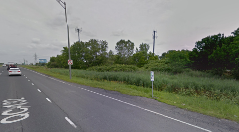 L’arrêt, dans une des deux directions, est sur le bord d’un trottoir. Mais de l’autre côté de la rue, il n’y a aucun trottoir ou passage piétonnier pour traverser et s’y rendre. L’intersection suivante est à quelques centaines de mètres, à l’ouest. Les murets de béton autour du poteau qui marque l’arrêt sont déplacés, ce qui permet aux utilisateurs du bus d’attendre sans être dans la rue.