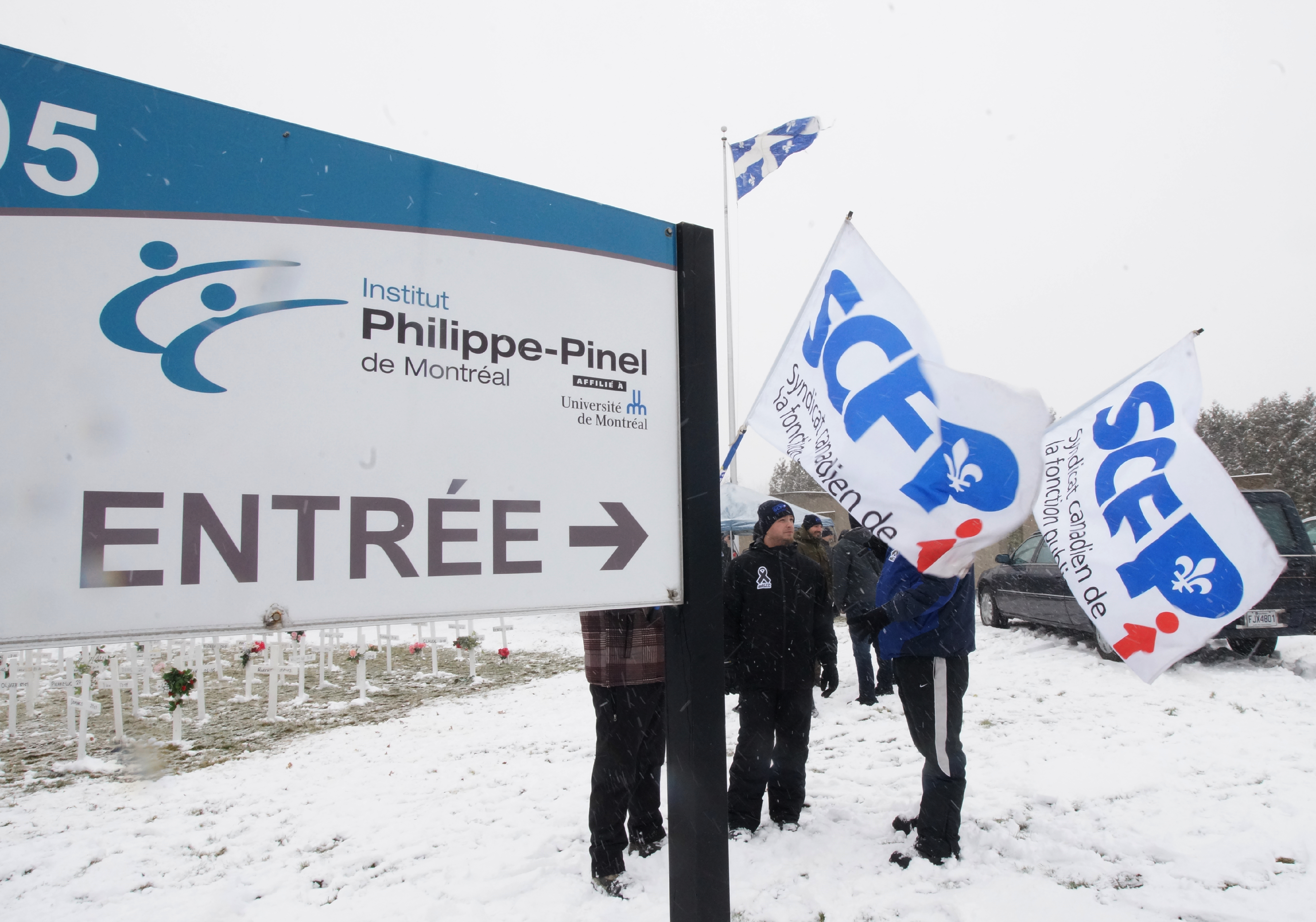 «C’est la mort de la sécurité, on ne la prend pas au sérieux», clame Sylvain Lemieux, président de la section 2960 du Syndicat canadien de la fonction publique (SCFP), qui se tient devant quelques dizaines de tombes creusées pour l’occasion.