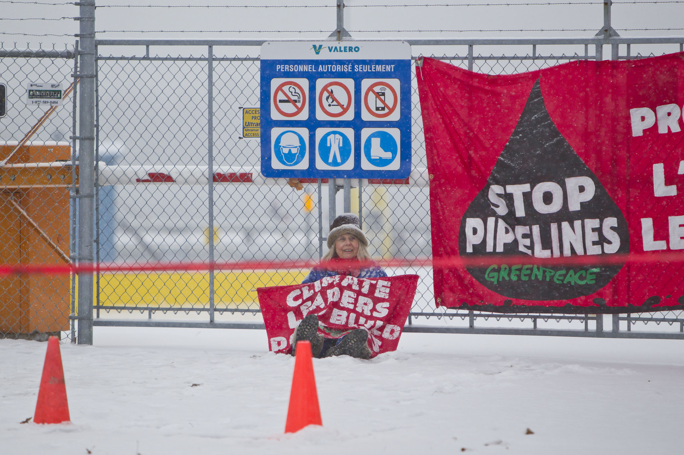 Trois activistes étaient en hauteur, ayant escaladé au lever du jour ces mêmes tours de chargement au terminal de la Ligne 9b de la compagnie Enbridge, au port de Montréal. Ils ont été délogés de leur perchoir en début d’après-midi et été arrêtés. Ils avaient préalablement déployé une bannière sur laquelle il était inscrit: «Stop pipelines: Protégeons l’eau et le climat».