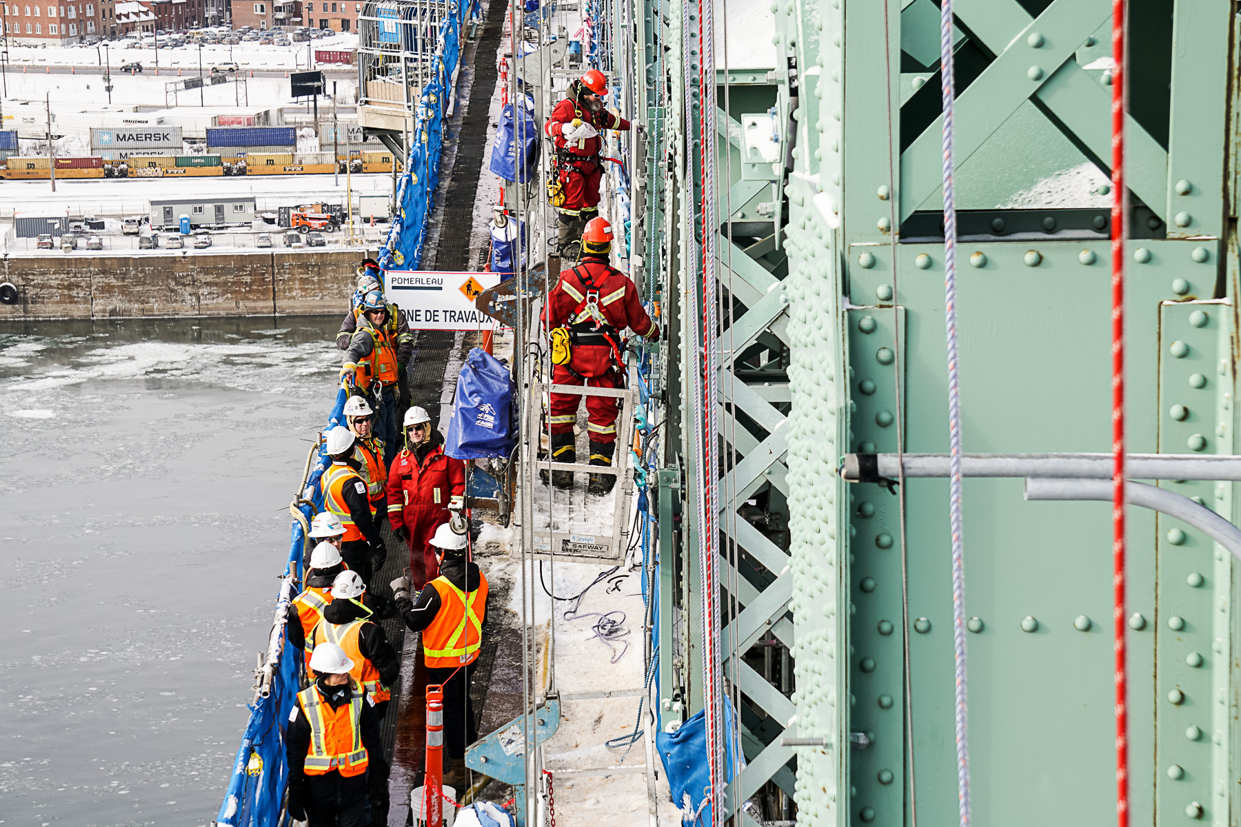 Afin de faire varier la lumière selon la saison, la météo ou l’intensité de la circulation, les luminaires doivent être installés avec précision sur toute la dentelle du pont. Il a donc fallu faire une visualisation 3D du pont grâce à des images de drone afin d’évaluer quels rivets (énormes clous métalliques) seraient retirés pour fixer les luminaires. Retirer près de 10 000 rivets n’est pas une partie de plaisir à 350 pieds de hauteur et par -20°C. «Il faut une scie à disque pour couper l’une des extrémités du rivet et un pistolet pneumatique pour le faire sortir du trou afin de pouvoir ensuite visser le rail de chaque luminaire», explique Antoine Audoynaud, ingénieur chez Pomerleau. Chaque luminaire a un emplacement précis, pas question de les interchanger.