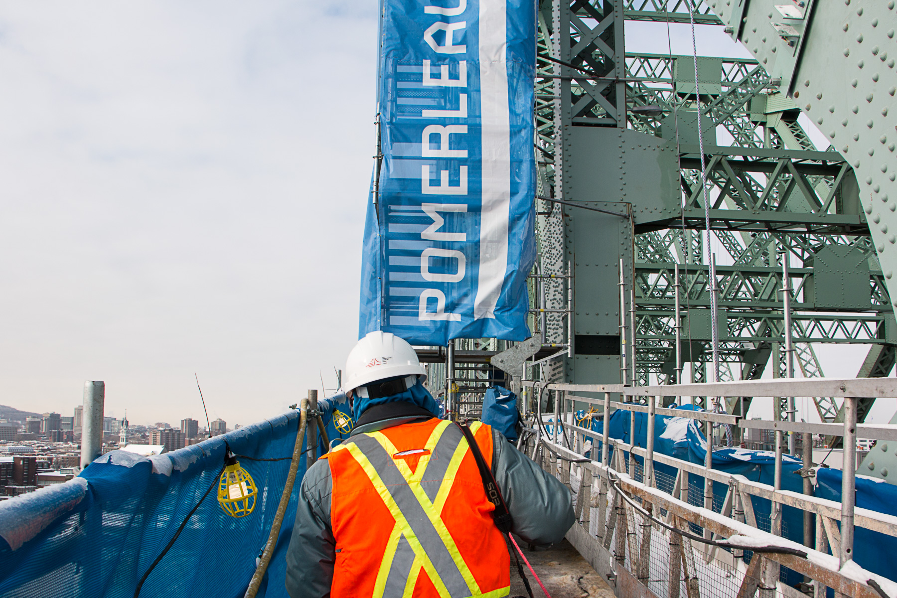 Depuis deux semaines, près de 100 ouvriers se relaient sur le chantier de jour comme de nuit et pour encore trois mois afin de concrétiser la vision de la firme Moment Factory. On y trouve, une vingtaine de monteurs d’acier, près de 30 électriciens qui vont installer les 10km de câblage, une quinzaine de surveillants de chantier, des représentants de la CNESST qui vont s’assurer que tout est sécuritaire, des déneigeurs et finalement des opérateurs de monte-charge. On les verra travailler quelle que soit la température ou la couleur du ciel, la seule contrainte étant la vitesse du vent. Le boulot le plus spectaculaire est probablement celui des installateurs de plateformes volantes qui travaillent littéralement dans le vide, comme des alpinistes.