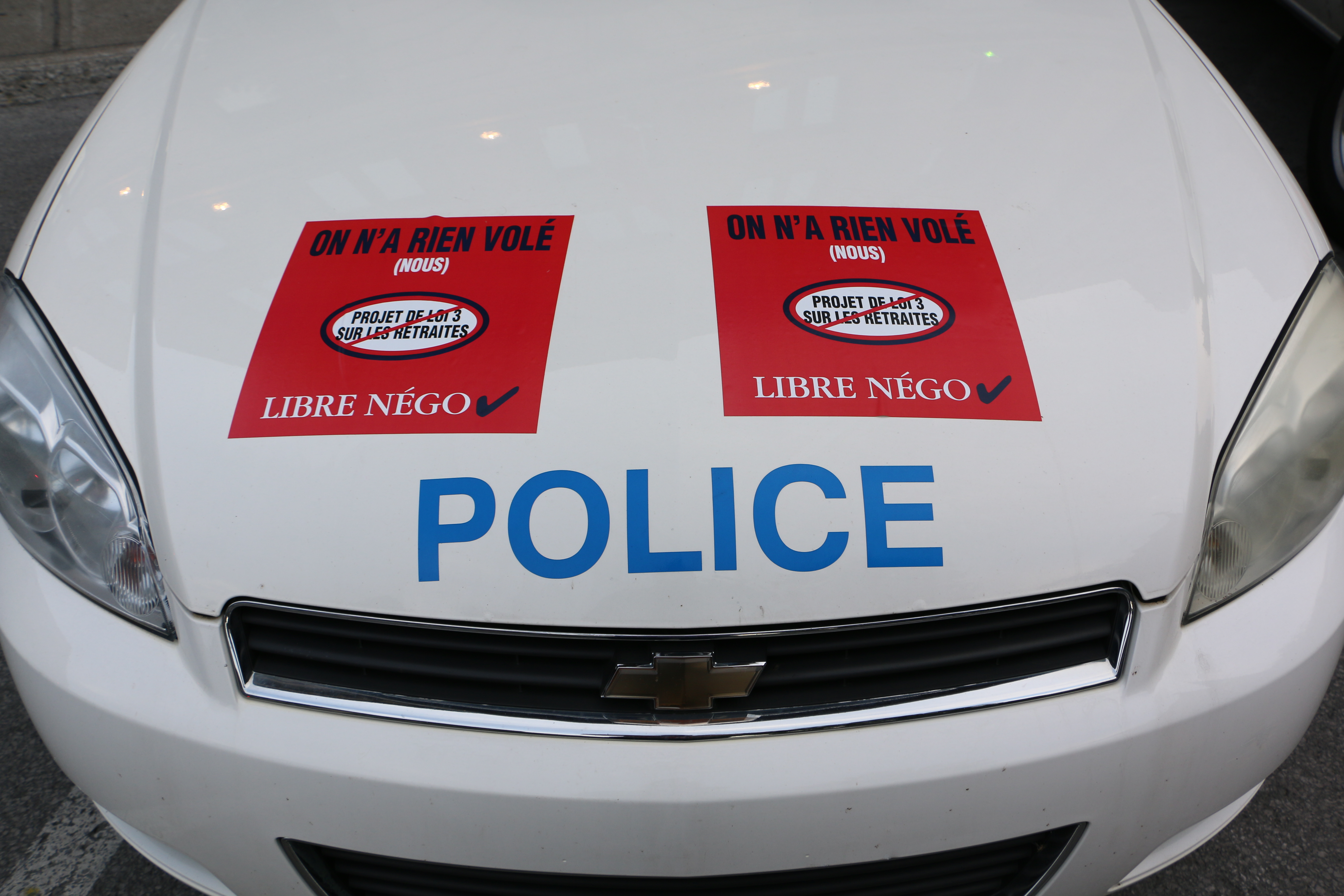 Ces collants avaient été posés par les policiers montréalais pour protester contre le projet de loi 3 du gouvernement provincial — devenu depuis la loi 15 — qui proposait de revoir les régimes de retraite du secteur municipal, une mesure législative qu’ils jugeaient désavantageuse pour eux.