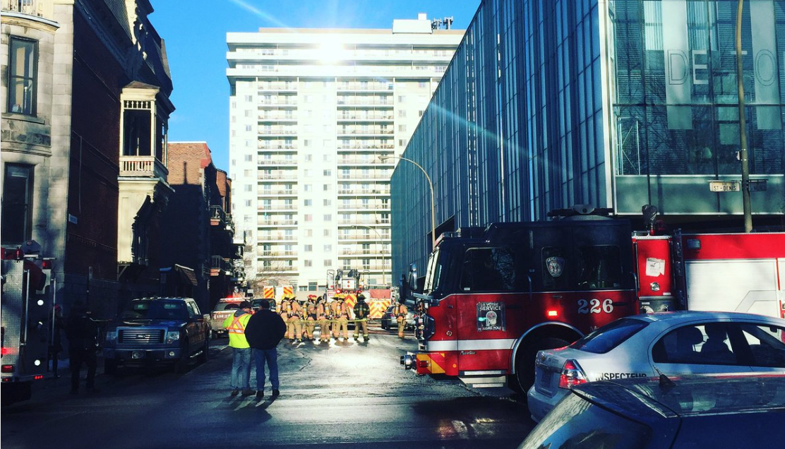 #incendie à l'ITHQ : selon nos infos, ce serait une voiture dans le stationnement intérieur. pic.twitter.com/vxBCTzJIDI