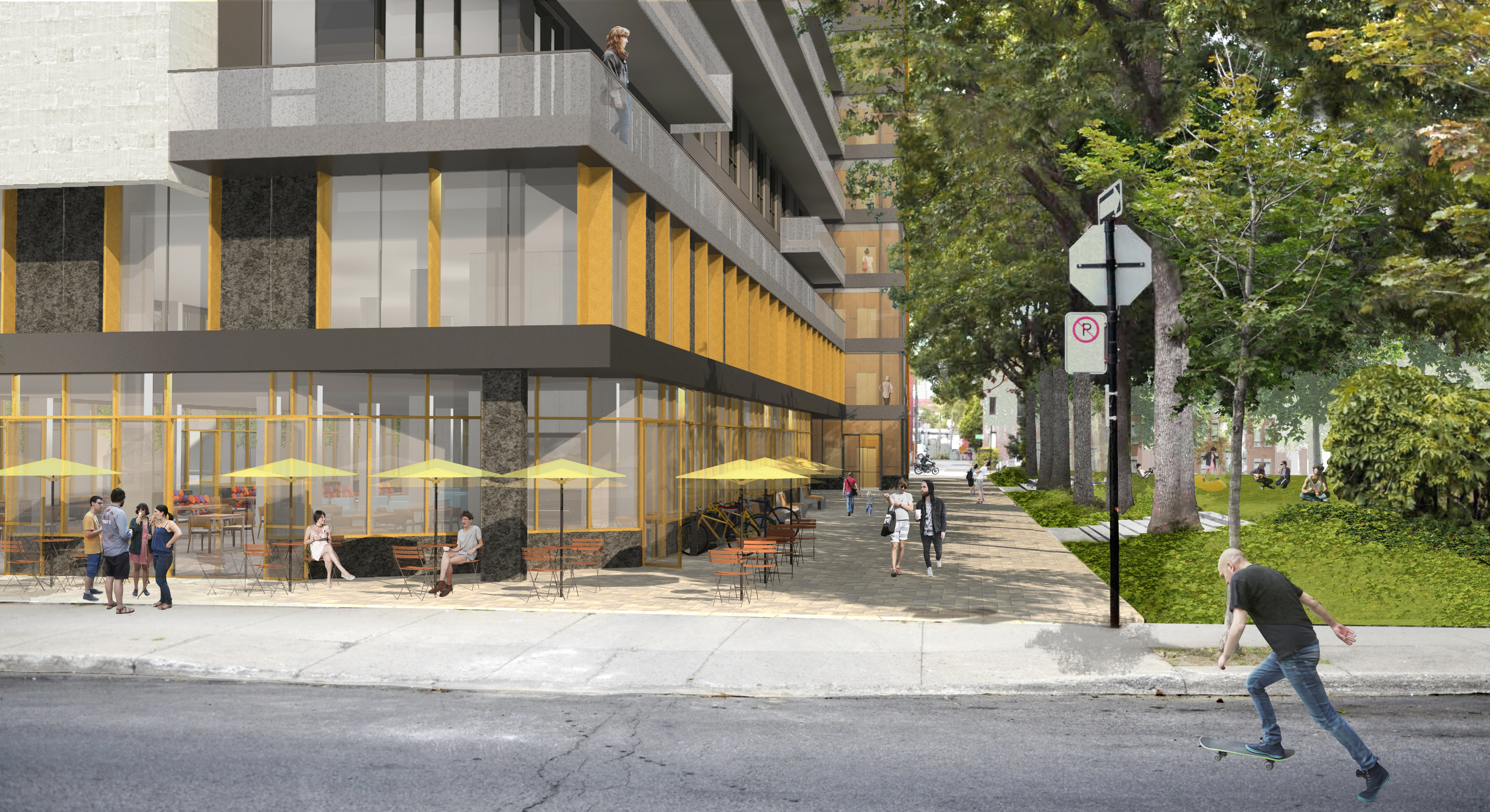 Le projet prévoit consacrer les deux premiers étages à l’occupation commerciale. Aucun commerce n’est confirmé pour le moment, mais M. Aljundi assure vouloir attirer des «services» pour les habitants du quartier. «On ne veut pas de commerces de style night-club ou de bars, parce que le quartier n’a pas besoin de ça. On cherche plus quelque chose pour rendre service aux habitants du quartier. On recherche des épiceries ou des cafés, par exemple», explique-t-il. Les deux premiers étages seront en retrait, ce qui permettra une animation de style terrasse tout le long de la rue.