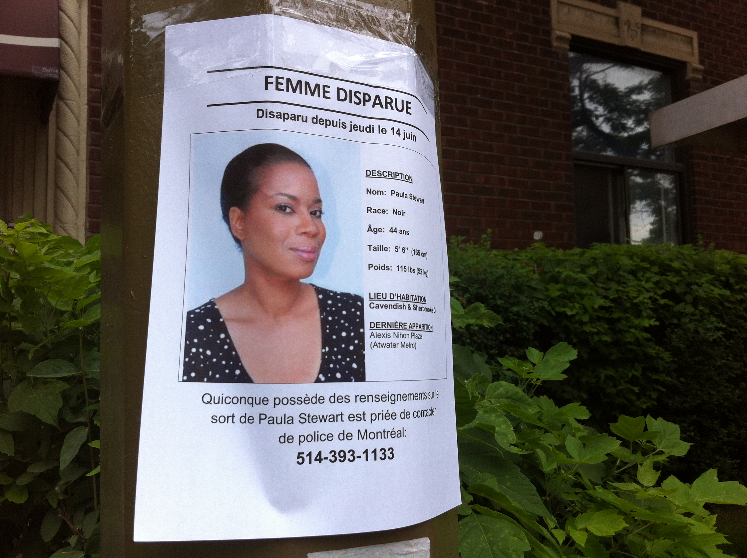 Quelques heures plus tôt, la sœur de la disparue, Sylvia Stewart, et sa famille ont décidé de placarder la photo de Paula dans Notre-Dame-de-Grâce. Mme Stewart espère ainsi inciter les citoyens à être plus vigilants afin de retrouver enfin Paula.