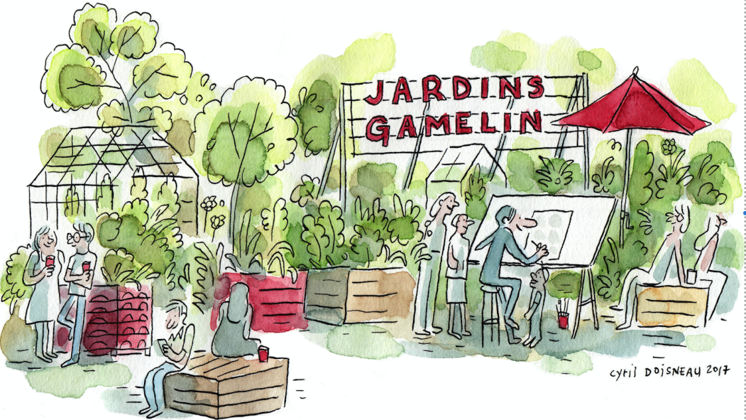 Pendant la belle saison, le bédéiste montréalais Cyril Doisneau installe sa planche à dessin aux Jardins Gamelin. Il y observe les allées et venues des passants pour y trouver des histoires à raconter. Il relate le fruit de ses découvertes dans des cases qui sont exposées les jeudis, deux fois par mois, aux Jardins Gamelin. Voici les premières histoires que le bédéiste a imaginées.