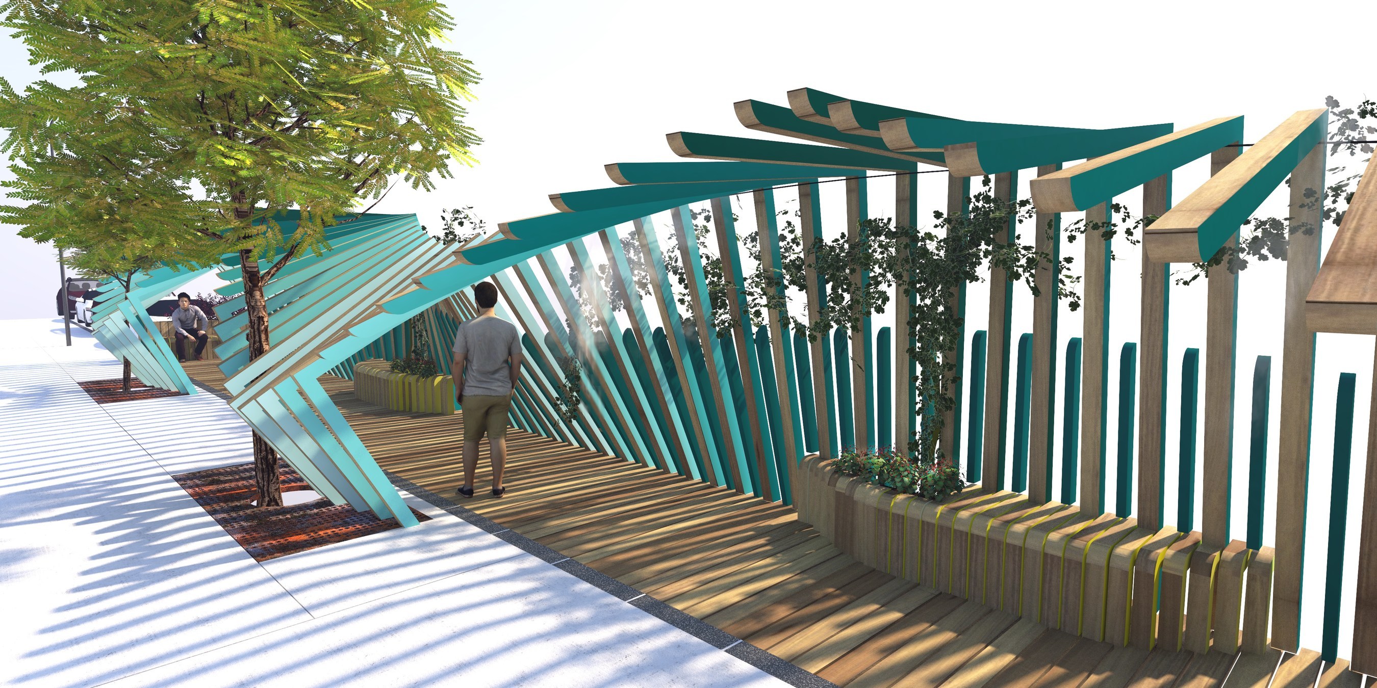 C’est la firme Arcadia Studio qui a dessiné les plans de cette installation, appelée La Vague et faite de cèdres de l’Ouest, qui s’étendra sur 22 mètres.