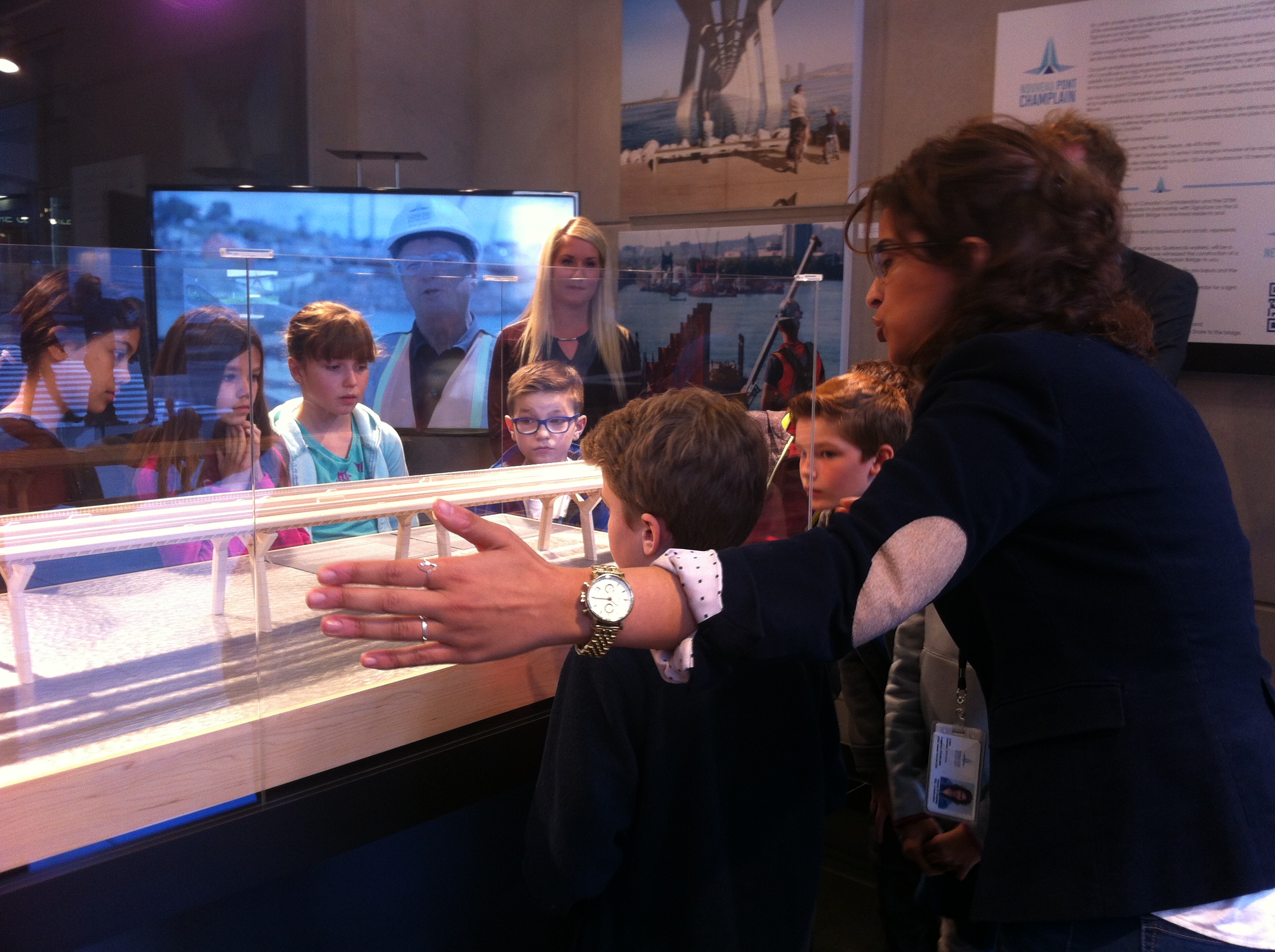 Dans l’espace réduit, on retrouve une maquette en bois du pont Champlain, quelques photos et explications techniques, ainsi qu’une vidéo qui compile les différentes étapes qui ont marqué la construction.
