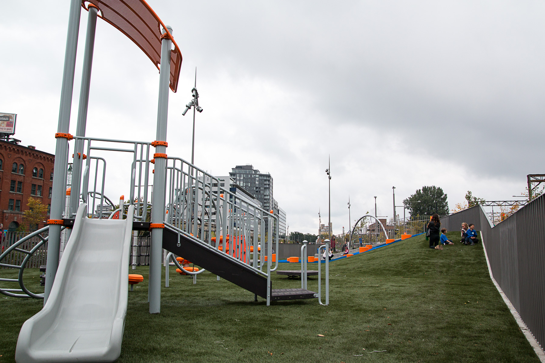 Aire de jeux, espaces verts et chaises longues sur le nouveau boulevard Bonaventure