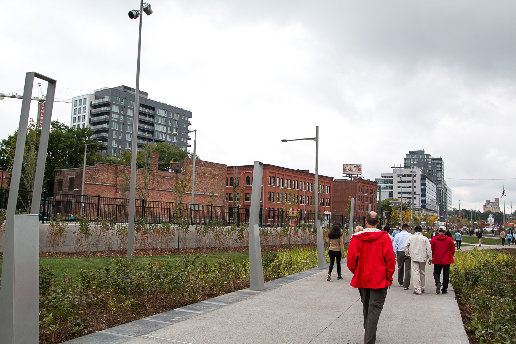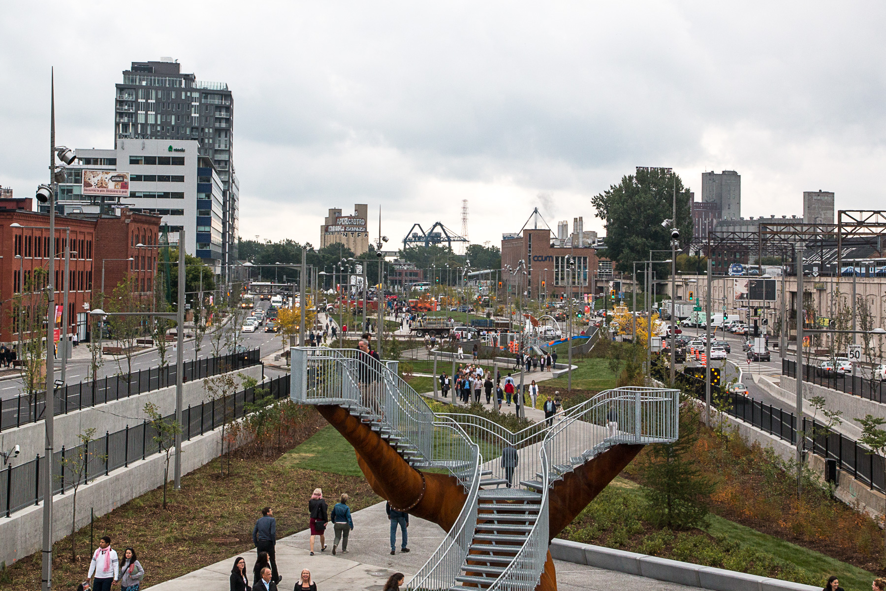 La Ville de Montréal a inauguré mercredi son nouveau boulevard Bonaventure, avec de nombreux aménagements destinés aux résidants, qui vient remplacer l’ancienne autoroute sur pilotis.
