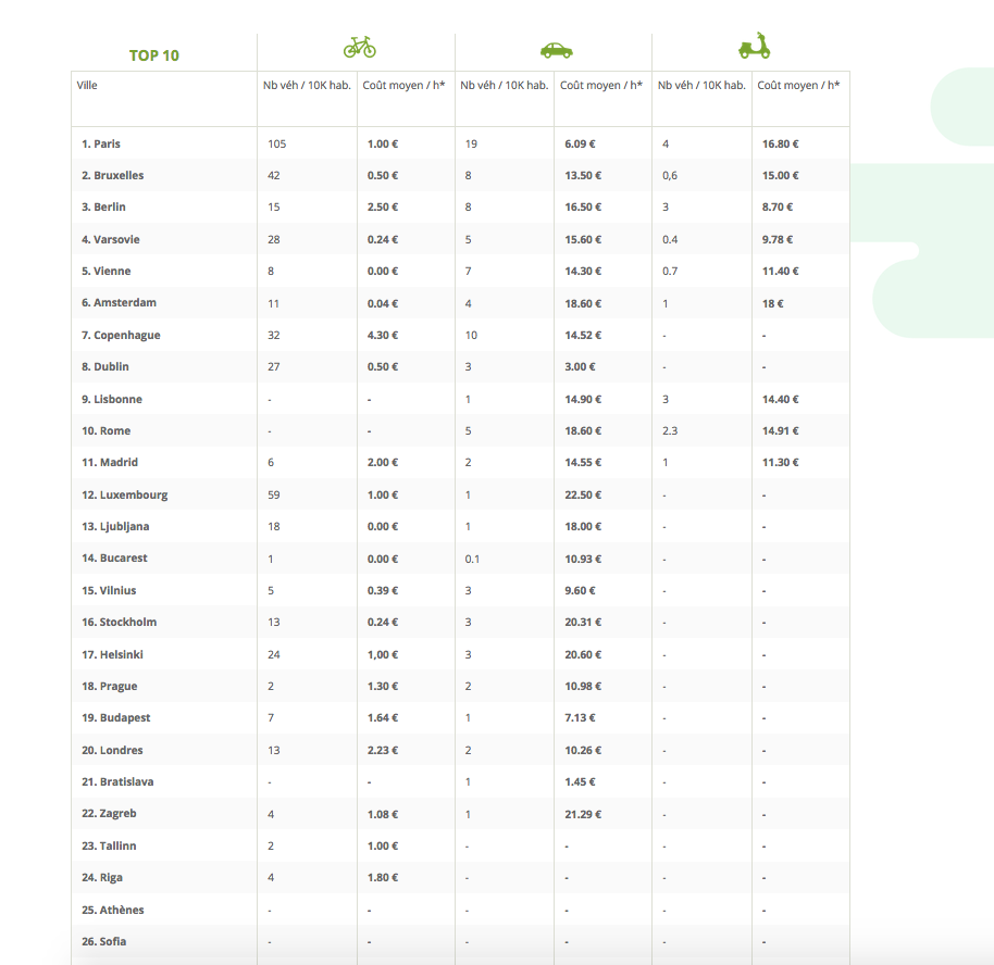 Sur le front des voitures en libre-service, Montréal fait aussi très bonne figure. Les 1073 véhicules de car2go et d’Auto-Mobile actuellement déployés représentent un ratio de 6 voitures pour 10 000 habitants, ce qui placerait Montréal en 6e position du classement européen.