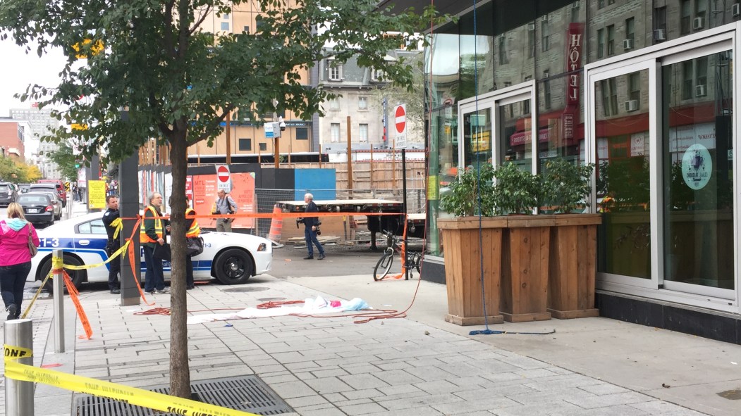 L’incident est survenu vers 10h en marge d’une activité de décalade organisée par Amnistie internationale le long de la façade de la Maison du développement durable, à l’angle des rues Sainte-Catherine et Clark.