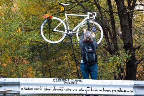Un vélo fantôme a été installé mercredi matin sur la voie Camillien-Houde du mont Royal, à l’endroit où une collision avec une voiture a coûté la vie à Clément Ouimet, le 4 octobre dernier alors qu’il s’entraînait sur la montagne. C’est le vélo du jeune cycliste de 18 ans qui a été accroché, après avoir été peint en blanc.